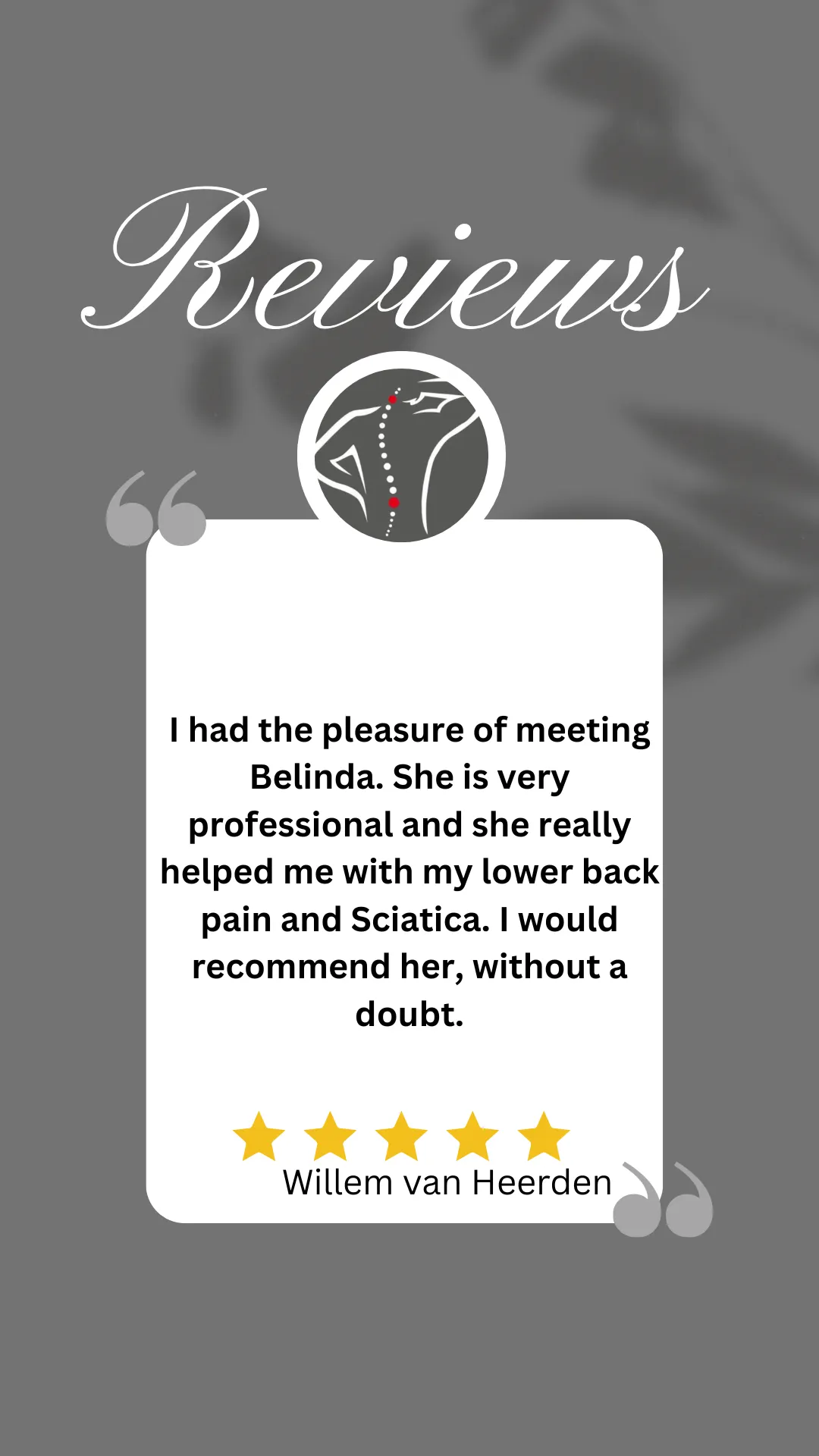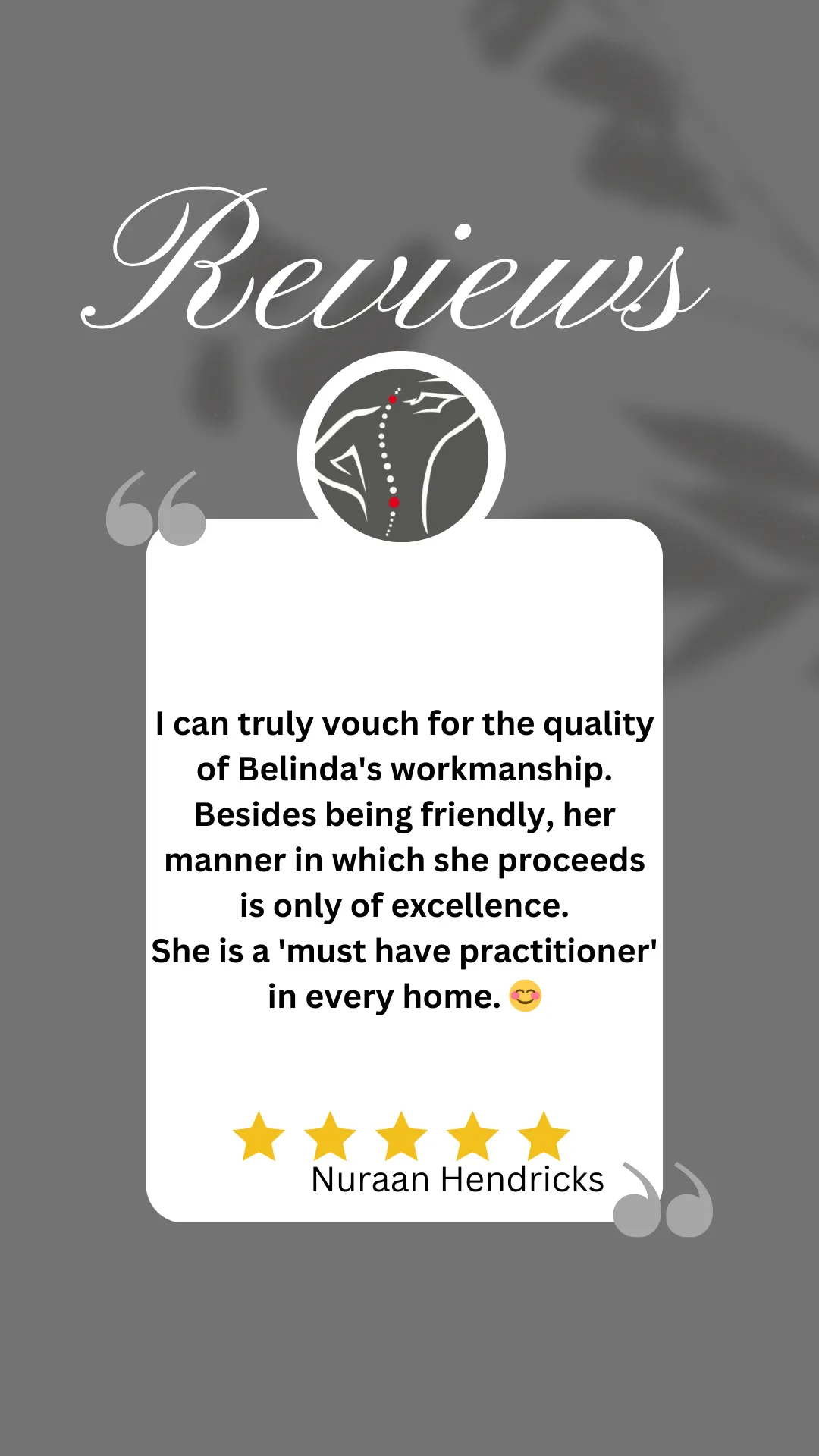 I'm Belinda van Niekerk, a qualified body alignment practitioner offering mobile services in the Strand/Helderberg/Gordon's Bay area. I am happy to assist my clients with any problem at hand. Should it be sport injuries, sleeplessness, back or neck injuries, Sciatica, the list is almost endless!